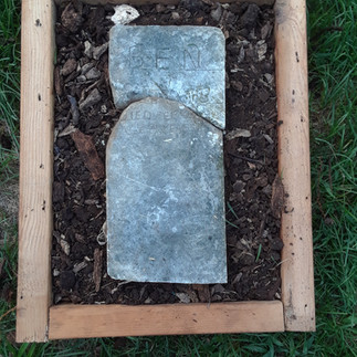 We are also trying a new landscaping and preservation experiment. Some of our markers are both separated from their base and fragmented. To keep them together and above ground so they don’t become further dispersed, fragmented, or vanish beneath the sod we are making small 2” x 4” frames filled with solid material (wood chips for now) to support the fragments. The frames will make the markers easier to see and (cross fingers) easy to avoid during mowing.